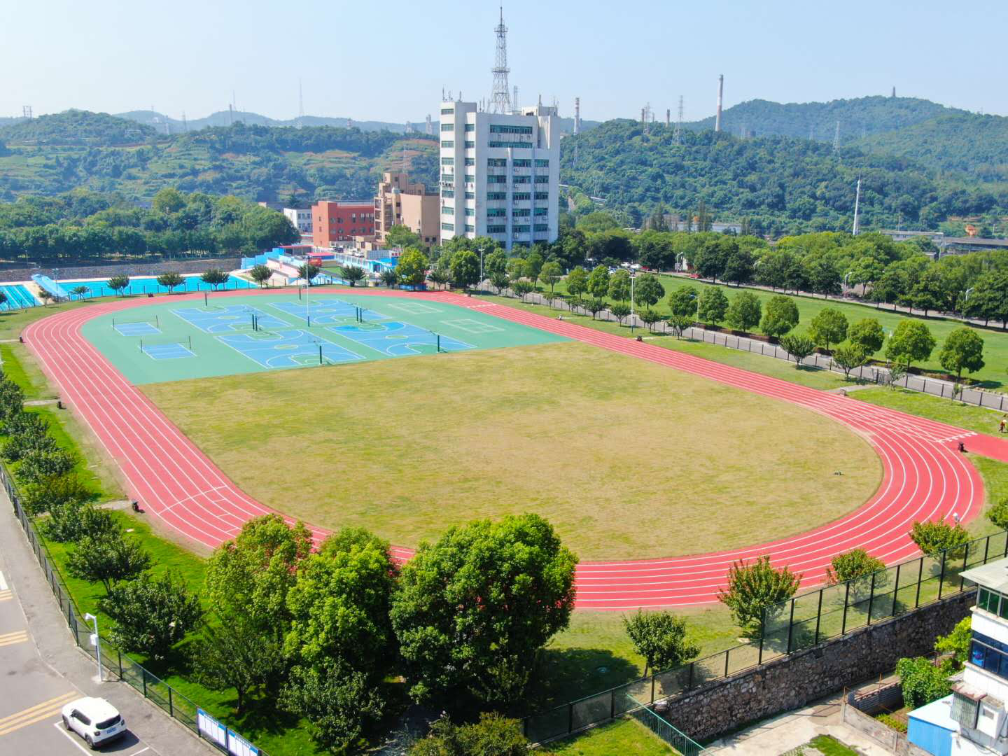石化运动场占地面积19430平方米,充分发挥了“一场多用”的集成功能,是由数个运动项目组成的多功能运动场所。内设有标准篮球场地4片,气排球场地2片,羽毛球场地2片,5人制足球场1个,400米6道塑胶跑道一个。