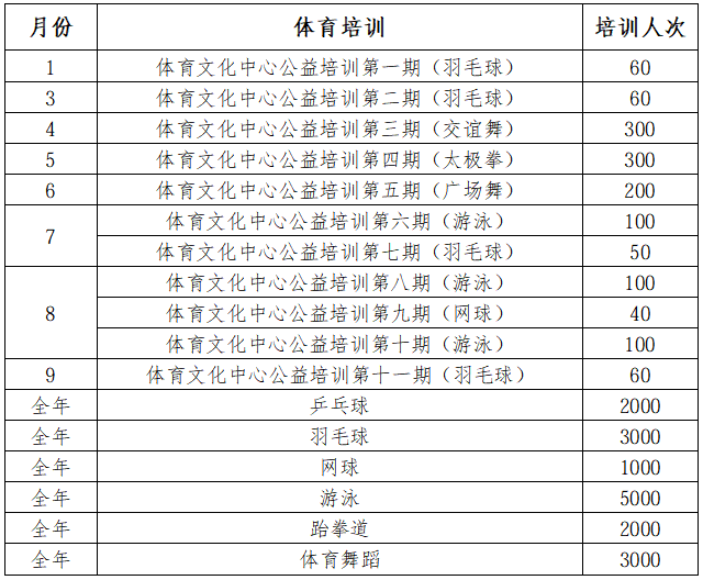 计划全年接待不低于36万人次、月均接待不低于3万人次、日均接待不低于1000人次,全年室外体育场地平均每万平方米接待不低于4万人次。