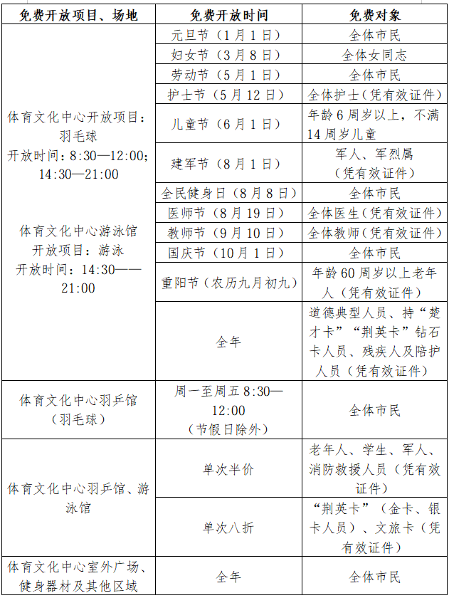 根据国家体育总局大型体育场馆免费或低收费开放工作要求,现将荆门市体育文化中心2026年免费或低收费开放工作方案公布如下: