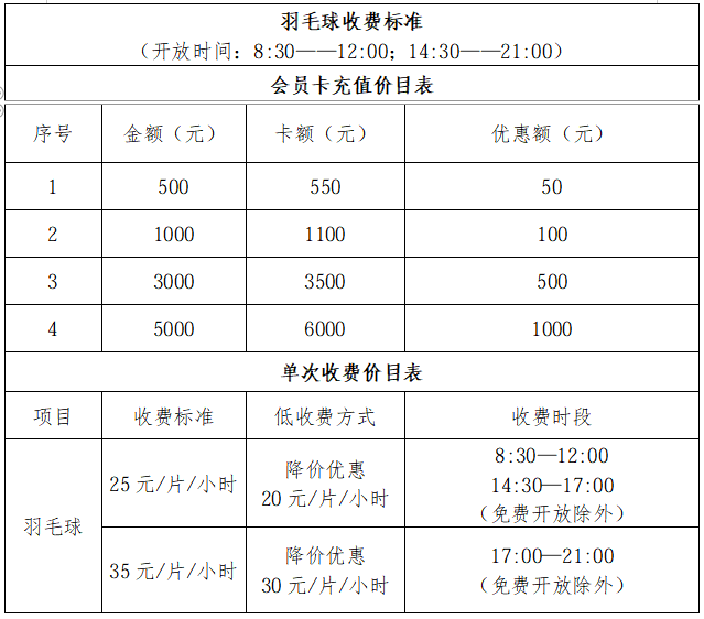 二、免费或低收费开放项目、开放时间及收费标准