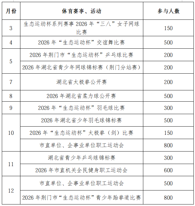 2026年度体育赛事、体育活动、体育培训计划表